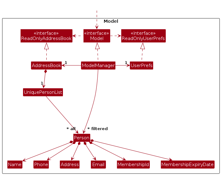Person objects (which are contained in a UniquePersonList object).Person objects (e.g., results of a search query) as a separate filtered list which is exposed to outsiders as an unmodifiable ObservableList<Person> that can be 'observed' e.g. the UI can be bound to this list so that the UI automatically updates when the data in the list change.UserPref object that represents the user’s preferences. This is exposed to the outside as a ReadOnlyUserPref objects.Model represents data entities of the domain, they should make sense on their own without depending on other components)Note: An alternative (arguably, a more OOP) model is given below. It has a Tag list in the AddressBook, which Person references. This allows AddressBook to only require one Tag object per unique tag, instead of each Person needing their own Tag objects.